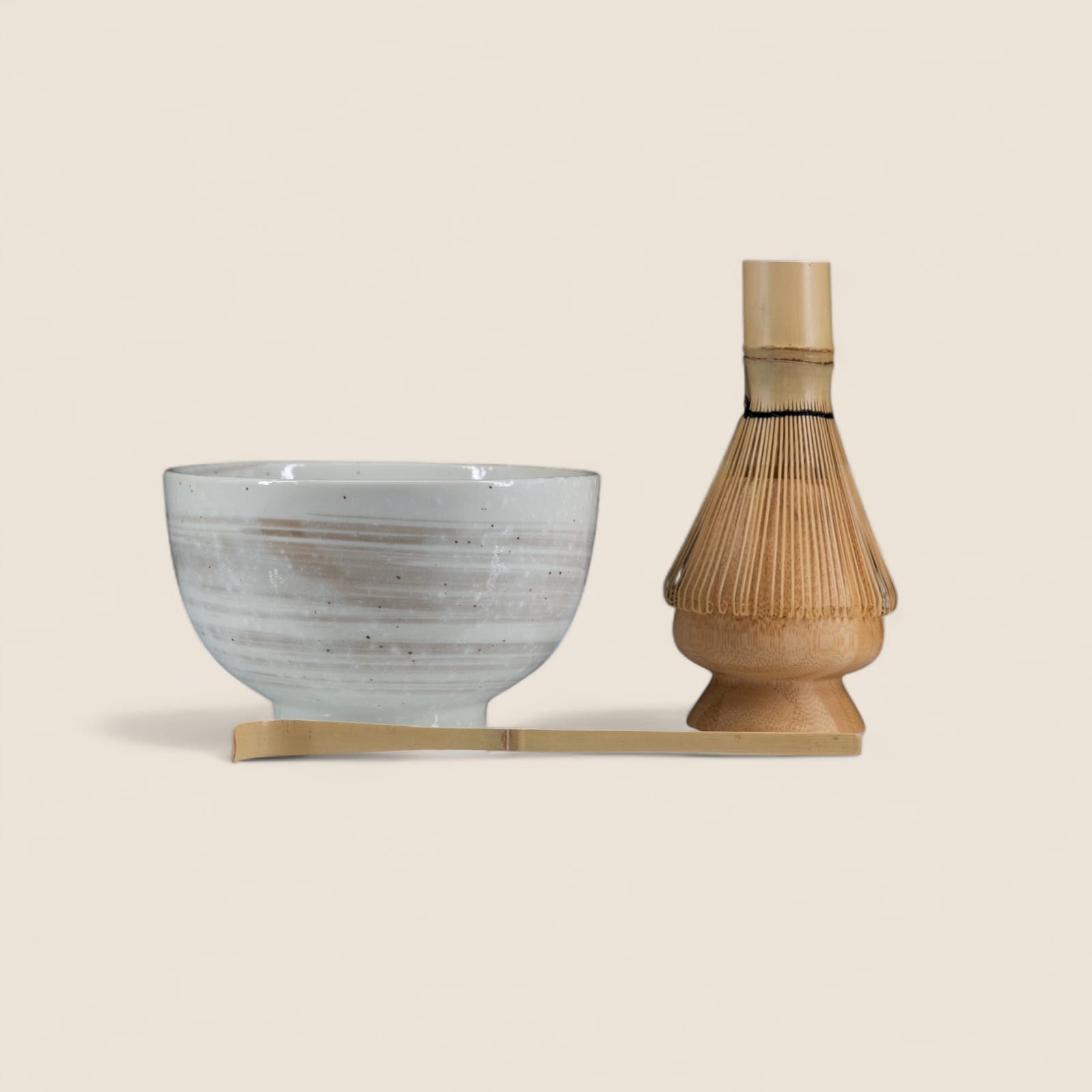 Komplettes Matcha-Set mit hochwertigem Matcha der ersten Wahl (100% japanischer Tencha). Enthält Schale, Chasen (Teebesen), Chasenhalter und Bambuslöffel; alles, was Sie brauchen, um zu Hause loszulegen. Perfekt als Geschenk oder für den Anfang.