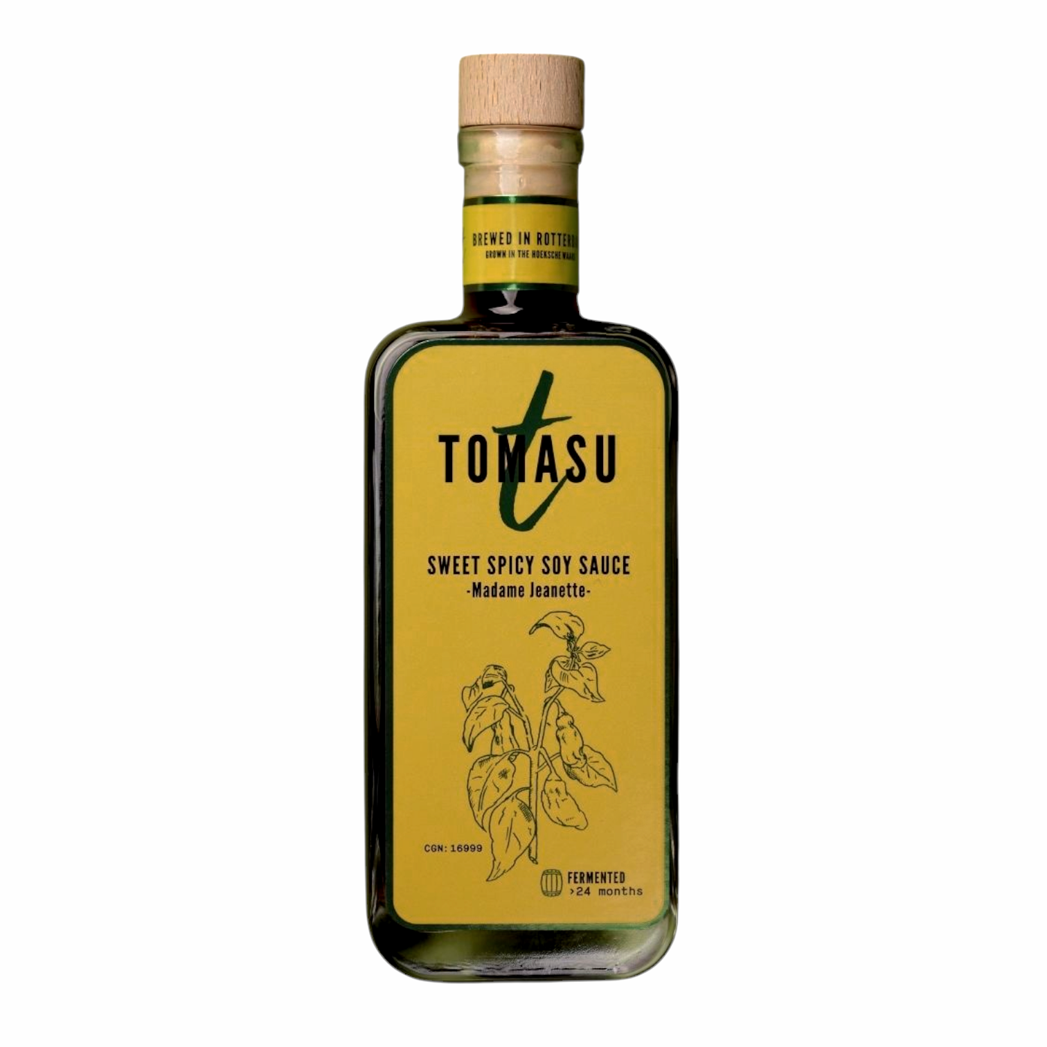 Limitierte Auflage der Tomasu Sweet and Spicy Sojasauce. Gebraut in den Niederlanden mit selbst angebauten Madam Jeanette Chilis. Extra voller Geschmack.