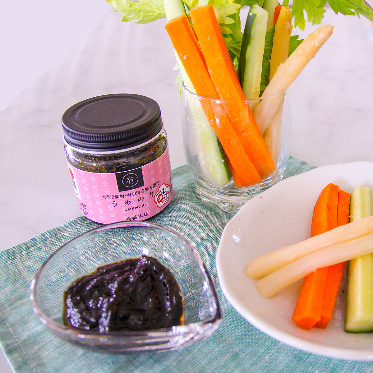 Umenori ist eine Tsukudani (Paste) mit Pflaumen aus Dazaifu und Ariake-Nori von höchster Qualität. Sie hat ein einzigartiges Gleichgewicht zwischen dem säuerlichen Duft der Pflaumen und dem reichhaltigen Geschmack des Seetangs und eignet sich perfekt als Topping für Reis- oder Fischgerichte.