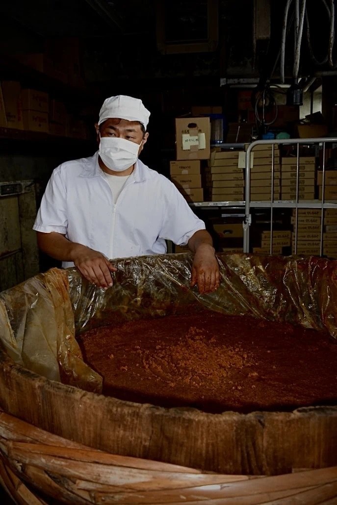 Mr. Kono is the 8th generation in a long line of misomakers dating all the way back to 1888. Some parts of his factory still date back to that time, making it feel like stepping back in time. Inside, there is a serene magical atmosphere. Colossal wooden barrels more than a hundred years old are lined up row by row, each one filled to the brim with delicious miso. There, the miso slowly matures until Mr. Kono (sometimes after two years!) finally gives his approval.