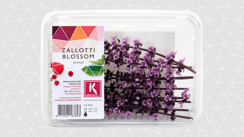 Zallotti Blossom is a decorative sprig with several small purple flowers of the African basil plant with a strong flavor of basil and mint. Especially decorative as a whole, but can also be used as individual flowers.