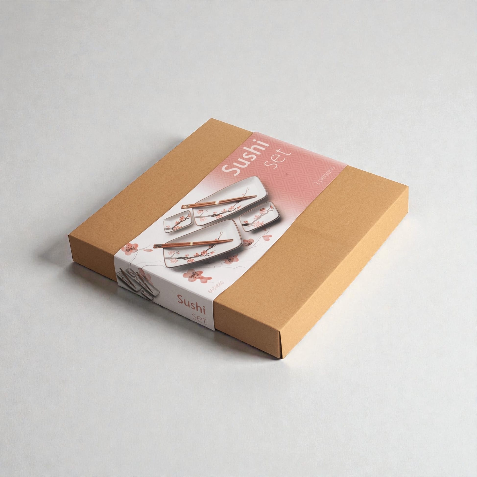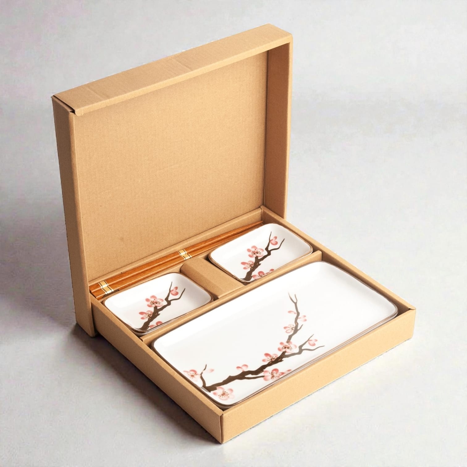 Prachtige sakura (Japanse kersenbloesem) serviesset, bestaande uit: 2 paar eetstokjes, 2 sushibordjes en 2 schaaltjes (voor sojasaus). Blikvanger voor een feestelijke avond, en perfect als cadeau!